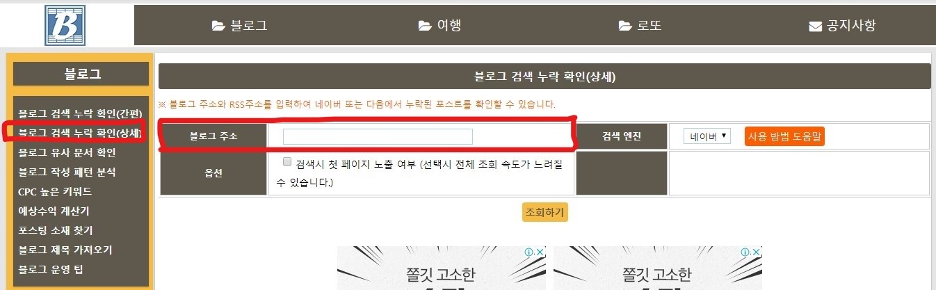 블로그 검색 누락 확인(상세)로 들어가 블로그 주소를 적습니다.