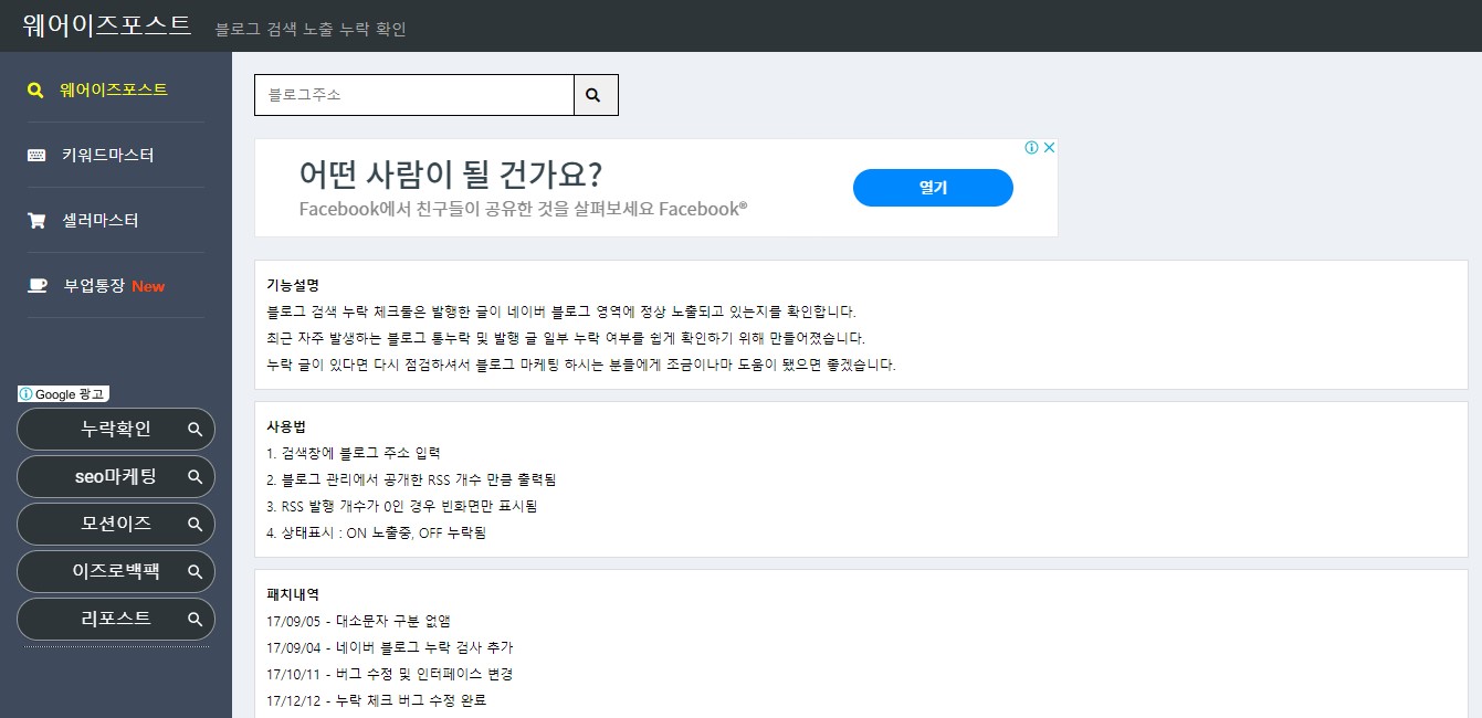 블로그 검색 노출 누락 확인과, 유효키워드를 검색을 할 수 있습니다.