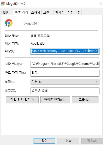 속성으로 들어가 대상에서 기존 경로에--disable-web-security --user-data-dir="C:\chrome" 이 부분을 추가해 줍니다.