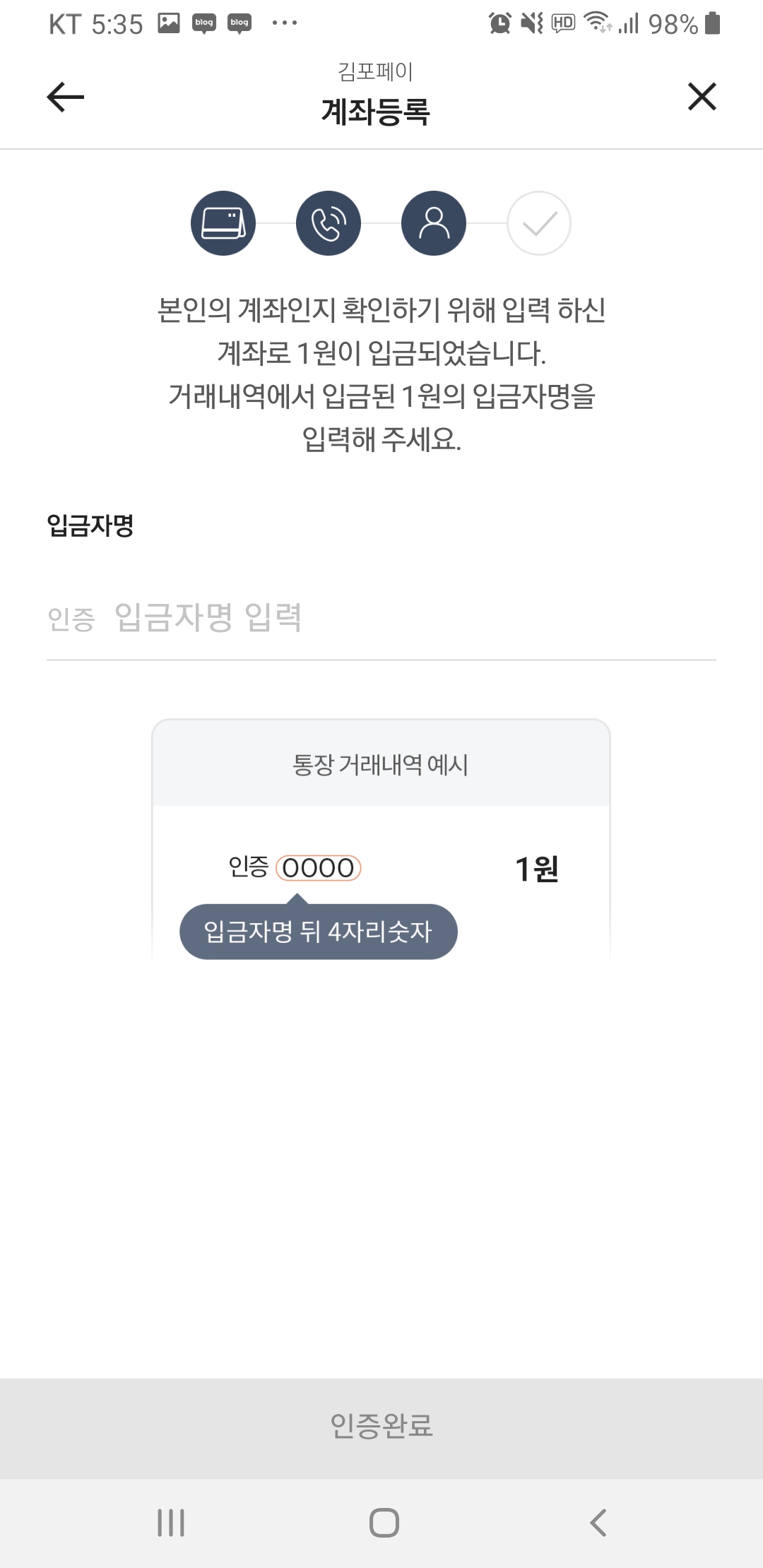 본인 계좌에 가 확인하면 입금자명에 인증OOOO이라고 1원이 송금된 것을 확인하실 수 있습니다.